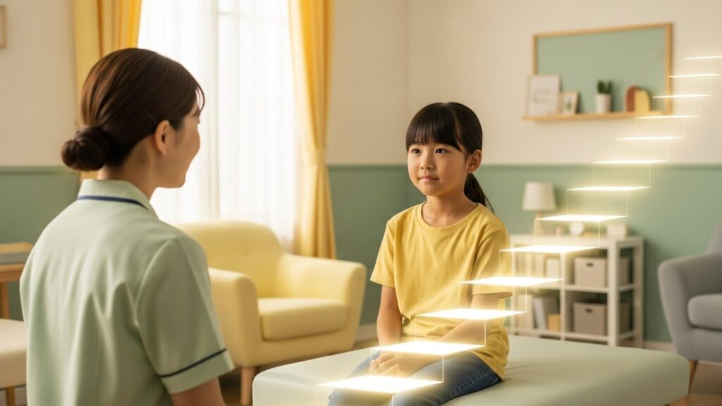 エクスポージャー法(暴露療法、Exposure Therapy)は、不安を引き起こす状況に段階的に触れることで少しずつ慣れていく治療法であり、不安症の治療では最も効果の高い方法の一つとされています。場面緘黙症の治療においては「段階的エクスポージャー法」という形で用いられることが多く、最初は非常に軽度の不安を感じる状況から始め、徐々により困難な状況へと進んでいきます。
